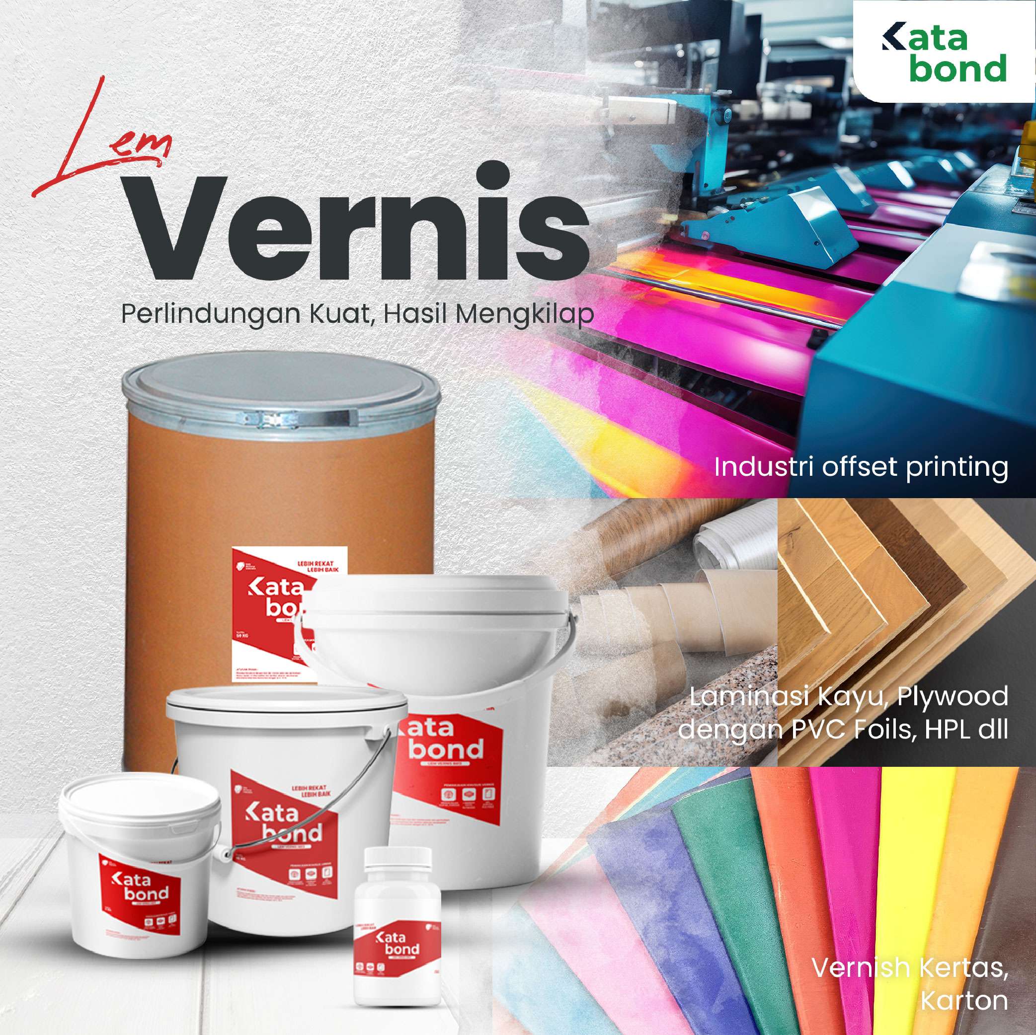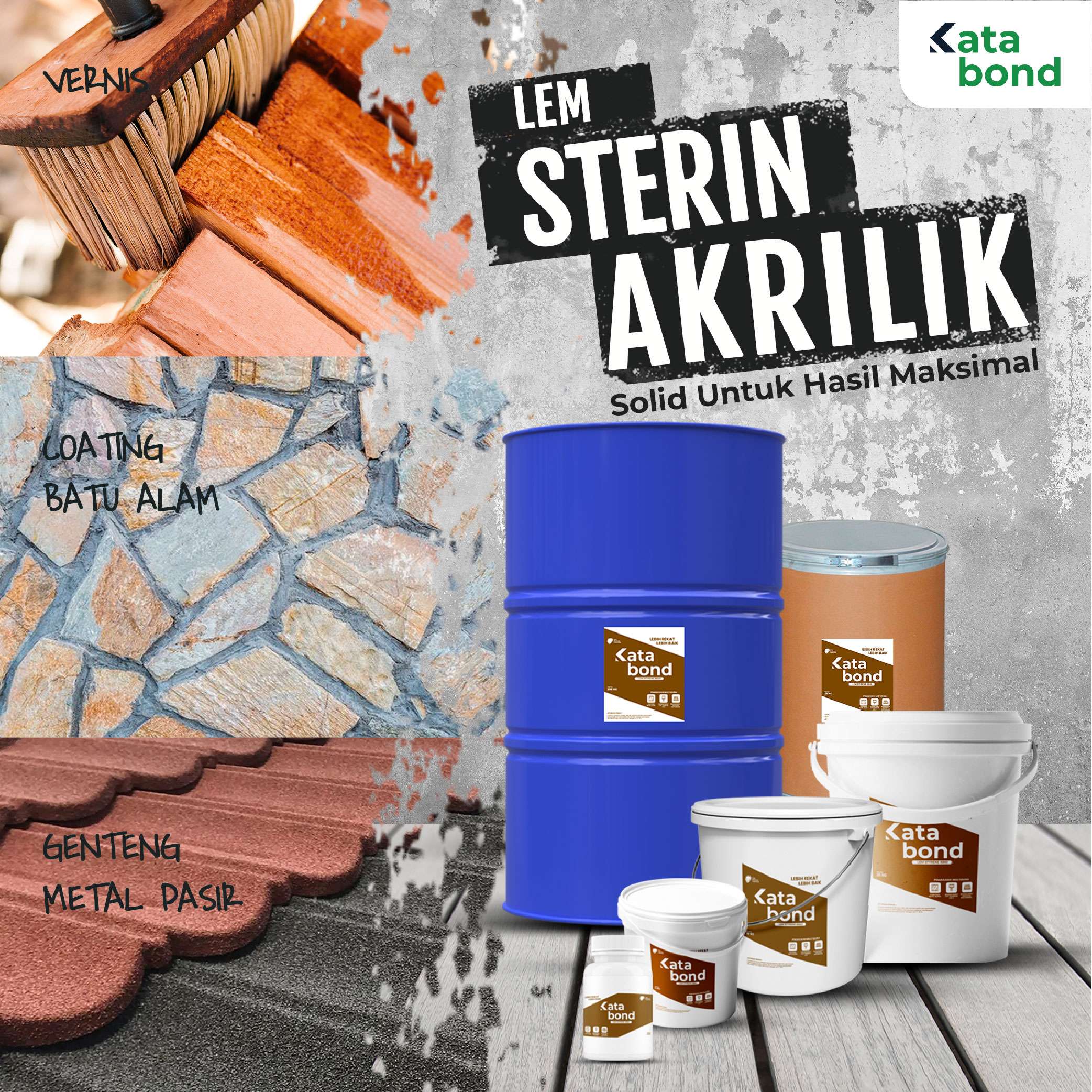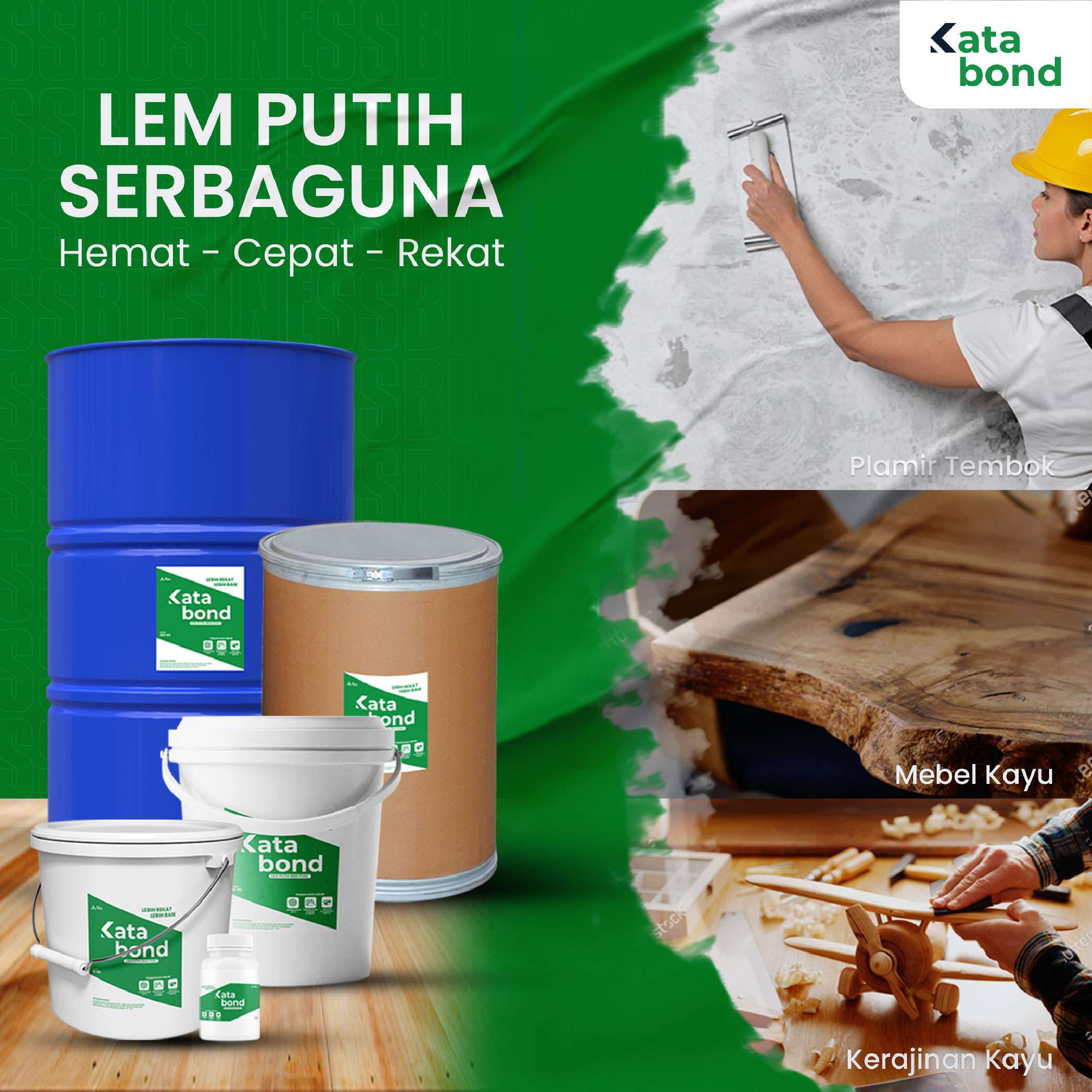 Didirikan pada tahun 2002, KATABOND adalah brand penyedia produk adhesive spesialisasi lem putih berkualitas & affordable untuk kebutuhan pasar. Baik industri mebel, kayu, vinyl, percetakan sampai kontraktor ataupun para pemilik bisnis, kami dengan senang hati menyediakan untuk mendukung setiap aspek pekerjaan anda, dimanapun dan kapanpun. Mari sukseskan bisnis anda bersama KATABOND. #LEBIHREKATLEBIHBAIK